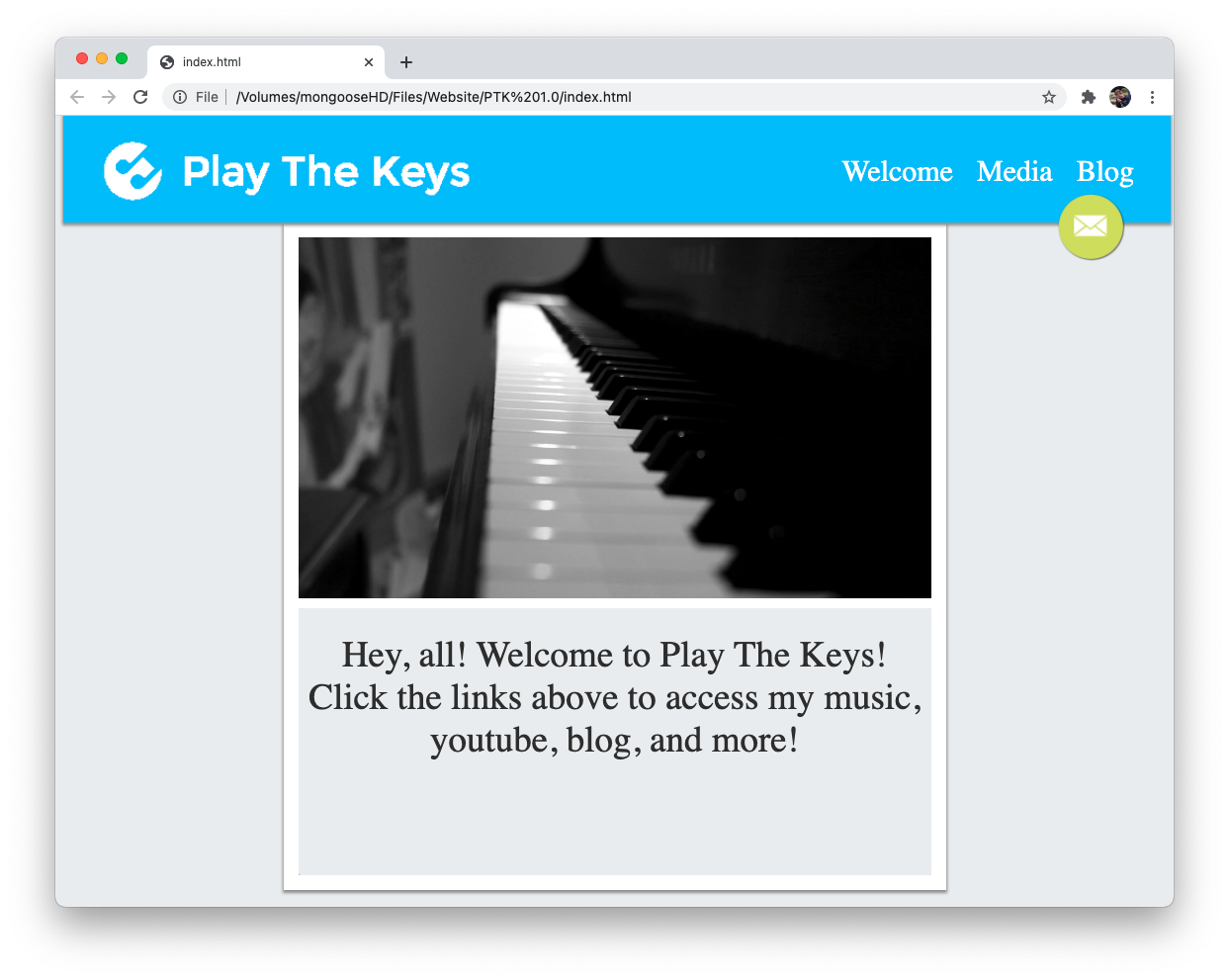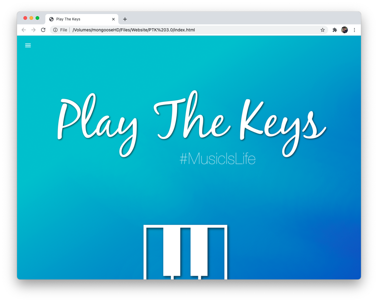 The official 1.0 release of the Play The Keys website, coded from scratch in HTML and released in 2015. All of the colors and buttons were simple image files that we produced using the free software "GIMP".