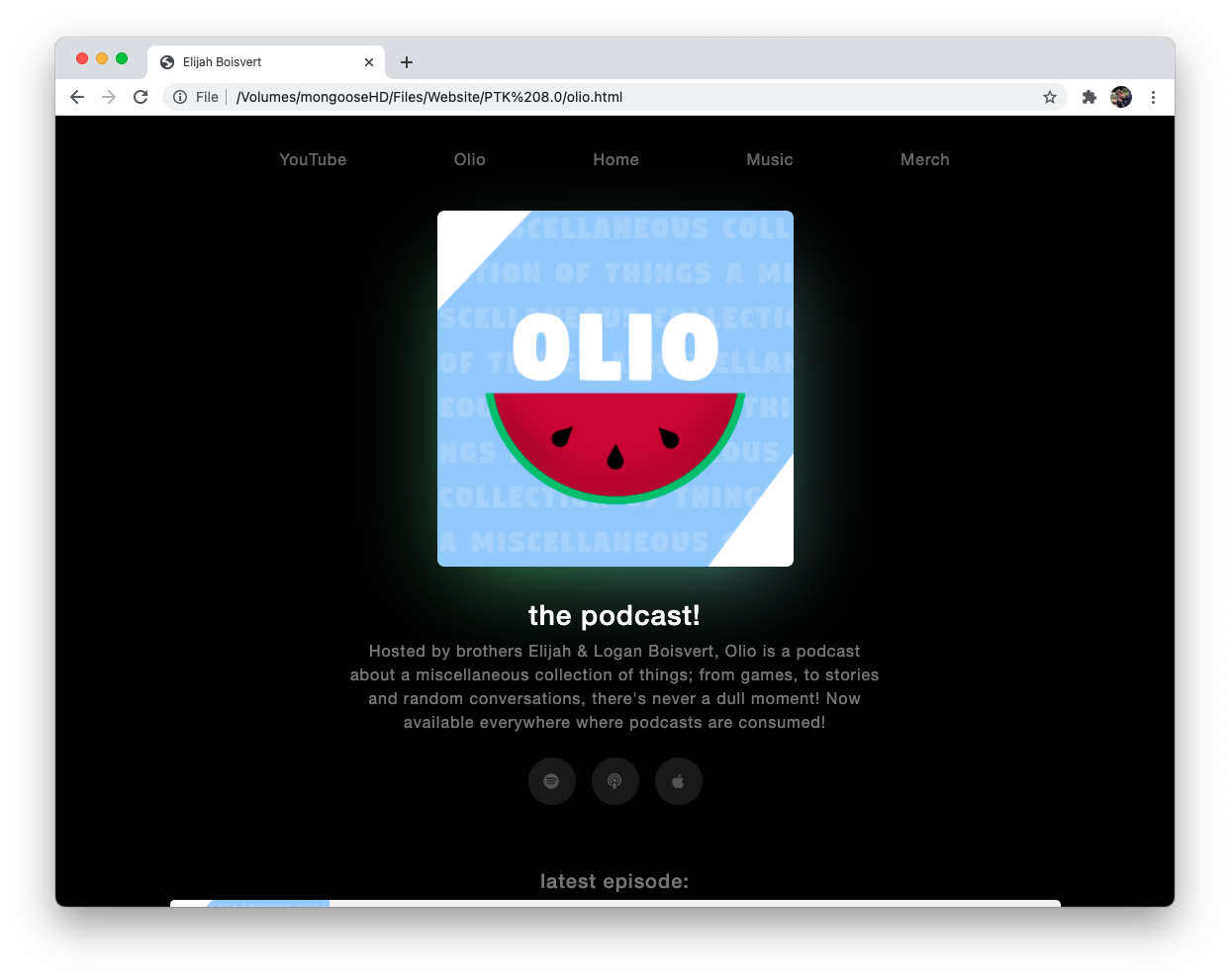 Clicking on the "Olio" tab in the menu bar of version 8.0 presented users with this page. The sole use of this page was to promote and link to Logan & Elijah's podcast, "Olio".